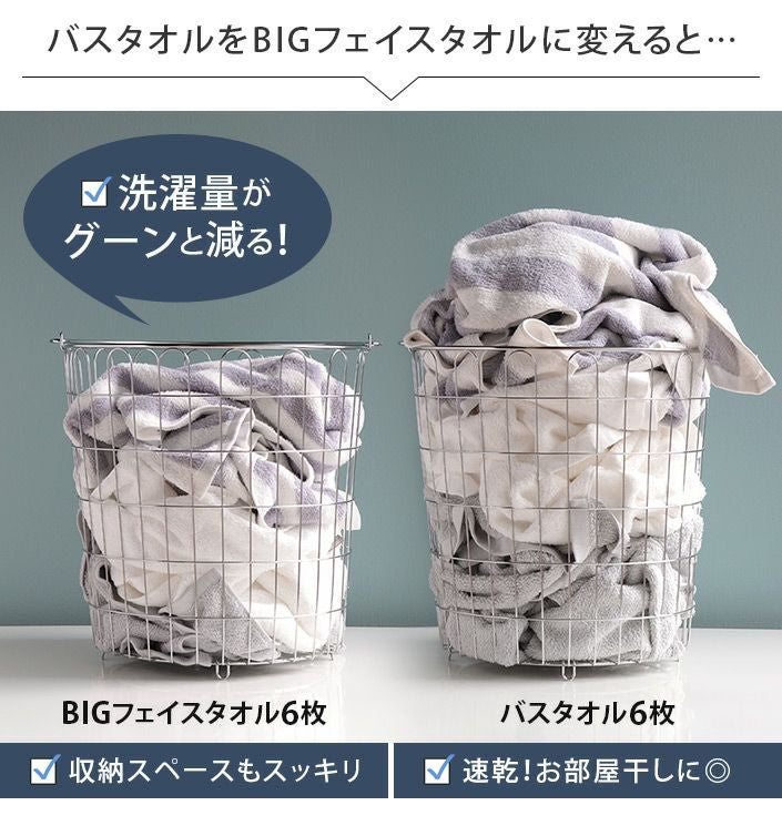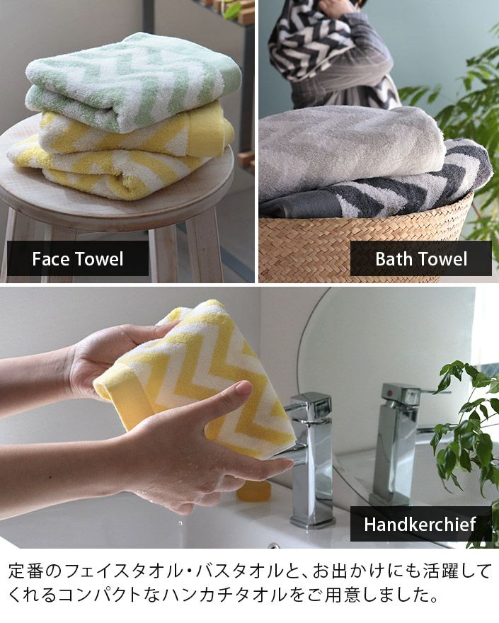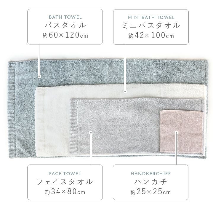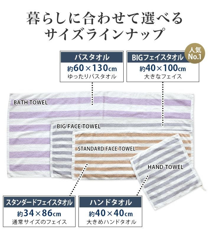 ハンドタオル、フェイスタオル、バスタオル、バスタオル代わりに使えるビッグフェイスタオル&ミニバスタオルの5サイズ展開。