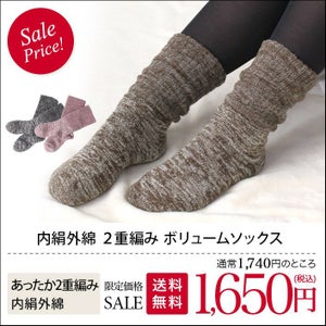 真冬は足首よりも少し上が冷えるので部分的にリブ編みになっていてレッグウォーマーなしでもいられます。色合いにベーシックでおしゃれな物がないのが残念。特にこのシリーズのミックス色は人に見られると恥ずかしい感じです。黒に近い濃いグレーとかが良いのですがシルク部分が白糸・綿部分がチャコールグレー糸なのでコントラストがはっきりしすぎておばあちゃんの靴下に見えます。
