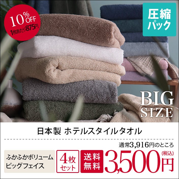 ホテル仕様のふかふか贅沢タオル ビッグフェイスタオルセット (送料無料)<同色4枚セット>日本製 ホテルスタイルタオル ビッグフェイスタオル 大きな100cm丈 【圧縮】